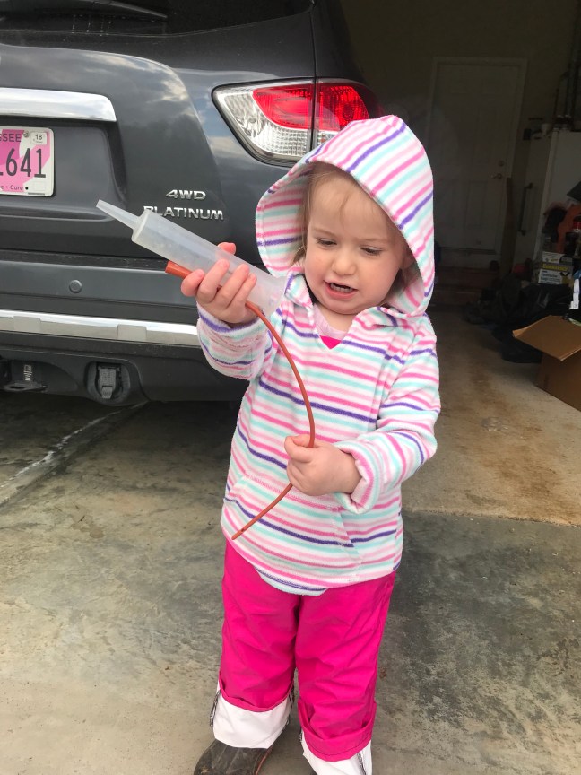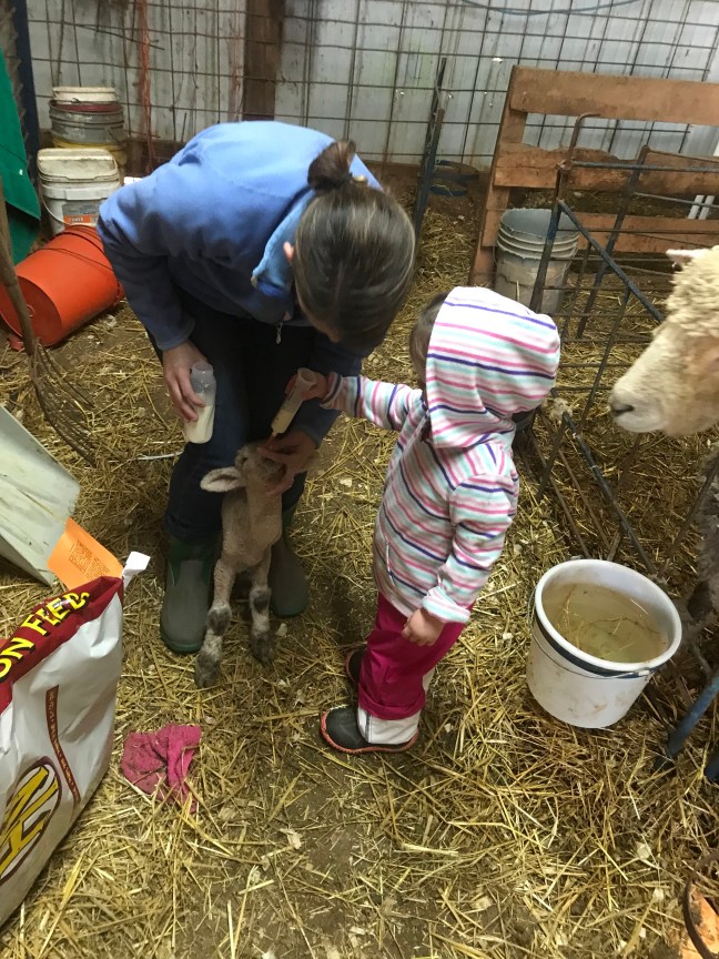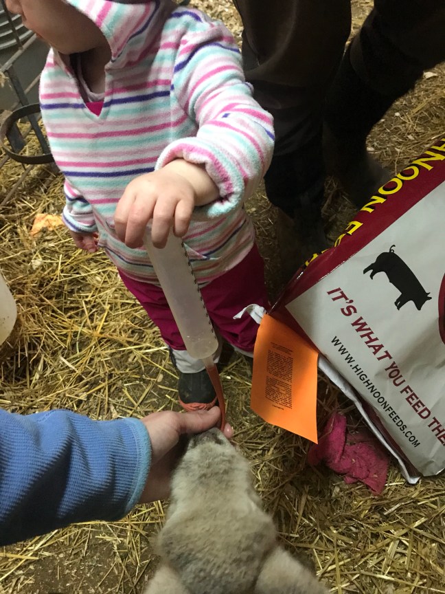 We have the best little barn helper! Tonight K helped me tube a lamb and was so excited. I told her what we had to do once we got to the barn and she kept saying “I go to da barn, I tube da lamb!” π She had to carry the syringe and tube to the barn and insisted on holding everything in place.